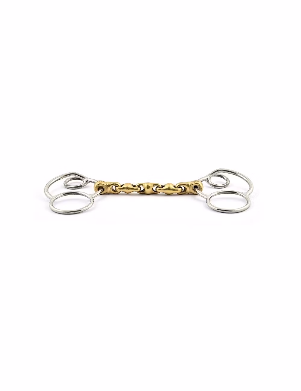 Composition: 3 ring bit with standard 17 mm thick cannons made of German Silver (65% copper, 23% zinc, 12% nickel) a relaxing and solid alloy.