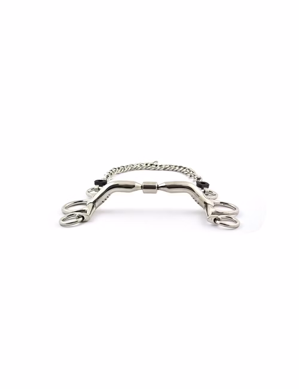 Tips: this bit mechanism makes it pivot around the central element. The bit anatomical shape perfectly fits the horse's mouth anatomy and the horse can easily take the bit thanks to the size of the cannons. Every Pelham bit can be used directly with two reins, with bit loops or with four reins. Therefore, the curb chain action can be softened by using other curb chain types as leather or nylon ones.