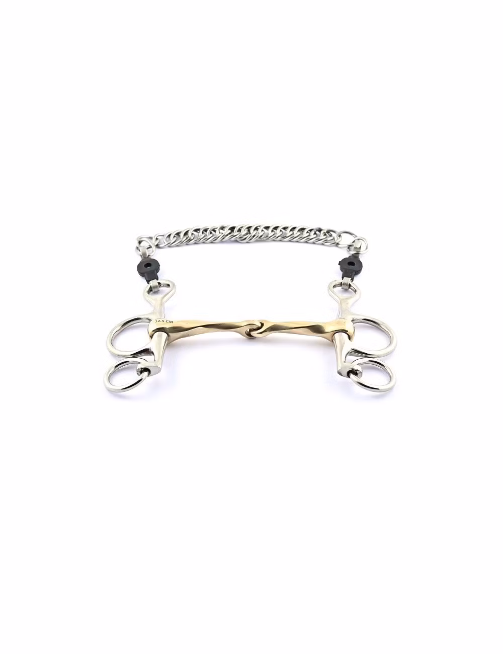 Tips: The twisted thin cannons give more action to this bit so the rider can also have more action and be firmer in the communication with the horse. Every Pelham bit can be used directly with two reins, with bit loops or with four reins. Therefore, the curb chain action can be softened by using other curb chain types as leather or nylon ones.