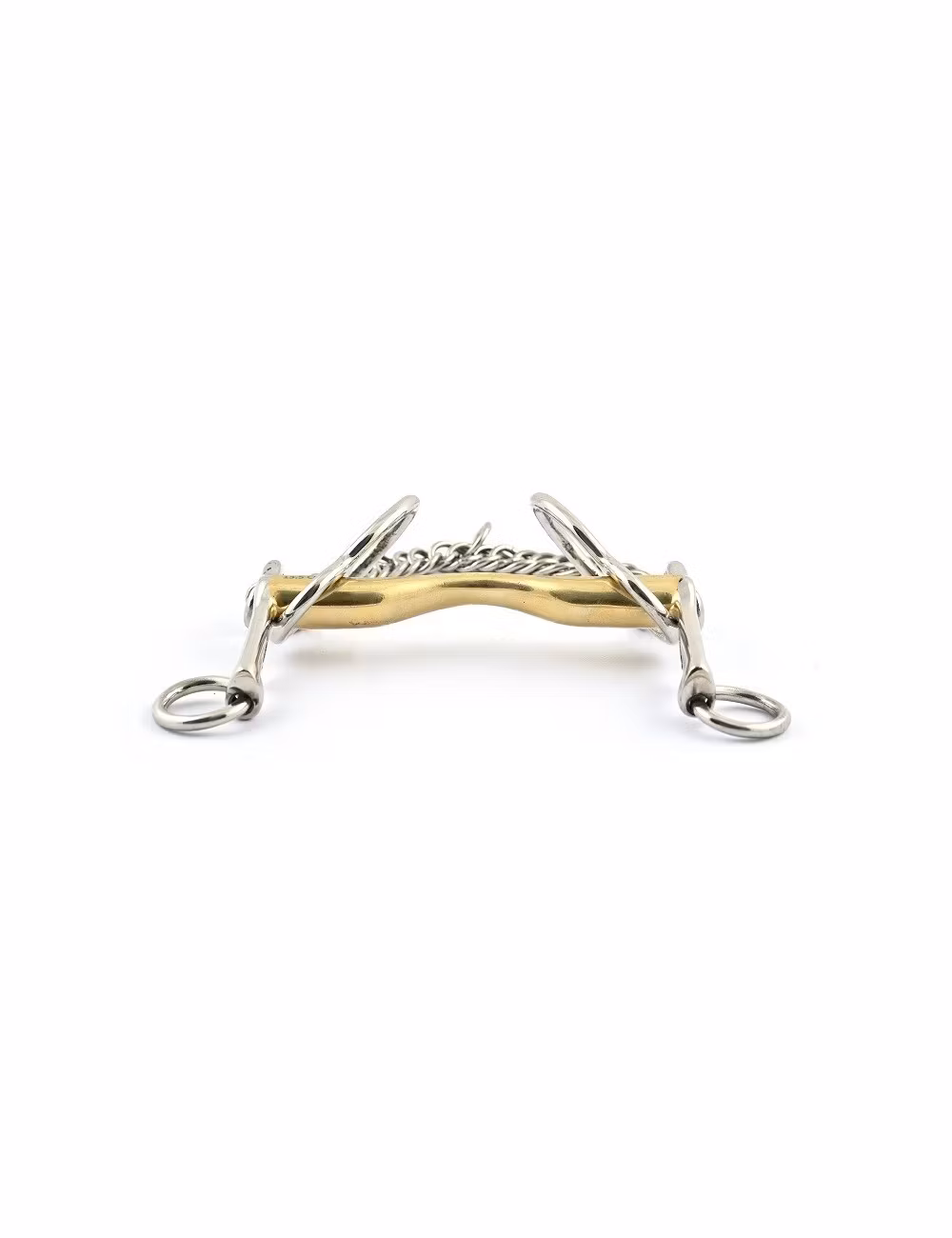 Effect: the Swales bit has some similarities with the Pelham bit but the horse doesn't feel any pressure on the neck because there is no action on the bridle cheek pieces. It is the only bit with a lever action that doesn't put any pressure on the horse's neck. It is used with a single pair of reins and a curb chain and it is less restricting than a Pelham bit as it does not have any action on the head/neck angle.