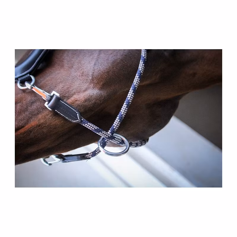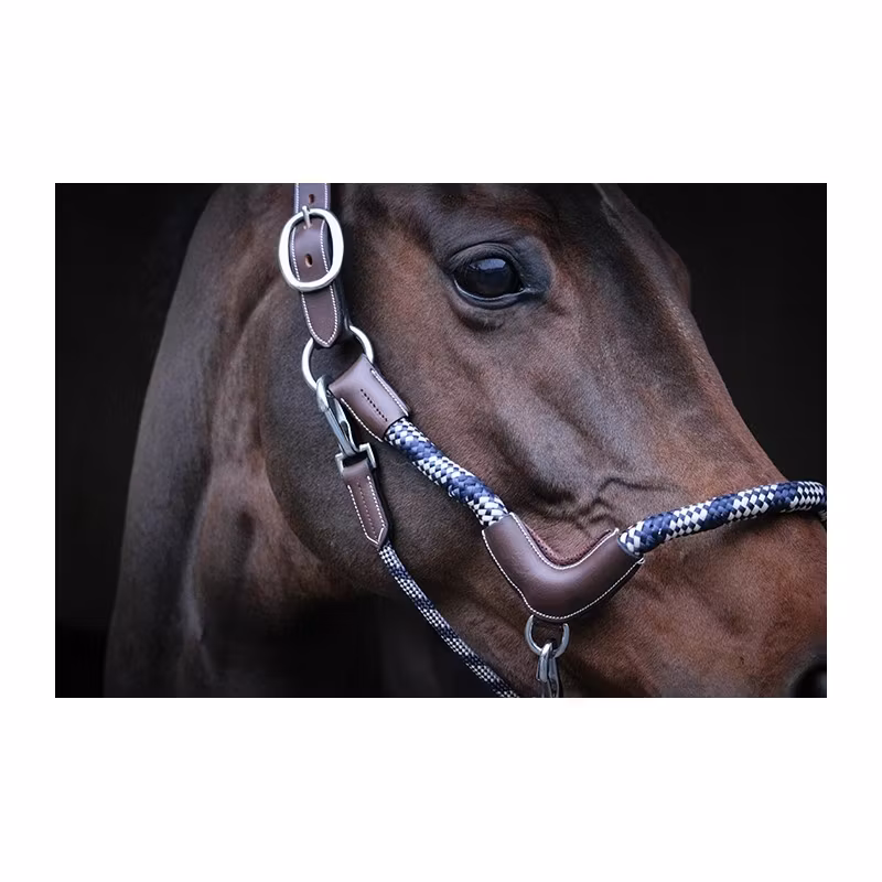 This halter is made with a mix of leather and blue, navy and cream rope. It has a large anatomical headpiece that is lined with micro-perforated leather. This grooming halter can be unfastened from all sides thanks to the crossed-ropes system as the throat lash and the four stainless steel hooks. It can be used to lead a horse and to tie it during grooming or during transport.