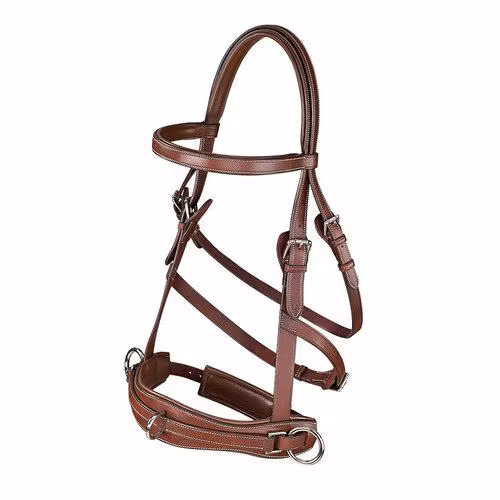 Tillverkad i vegetabiliskt garvat amerikanskt läder. Fodrad nos, nacke och pannband. Nosgrimma med två ringar på sidan och D-ring på mitten, nosgrimman är utan järn som är snällare mot hästen. Samtliga beslag är rostfria och skyddade med läder mot hästen.