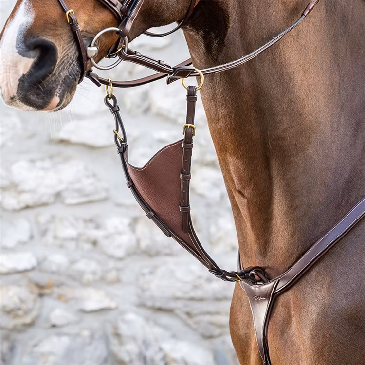 Justerbar kort BIB-martingal tillverkad i fint spanskt läder med mässingsspännen och vit mönstersöm. Fästs enkelt i halsrem eller brösta.