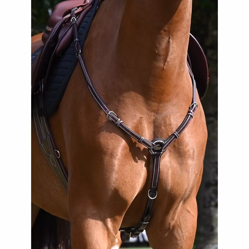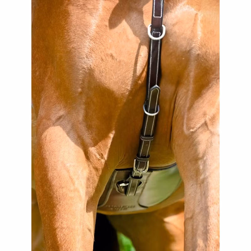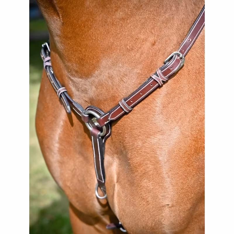 Matching the Tuesday Bridle with the contrasting topstitch, the breastplate must be attached to the saddle little rings. The breastplate helps keeping the saddle in place during a whole session so it doesn't shift back on the horse's back.