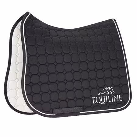 Dressyrschabrak med Equiline-logga och tunn vit passpoal. Tillverkad i allergivänlig och antikrymp-behandlad bomull med insida i extra mjuk bomull. Insidan är i ofärgad ecru för att förhindra att färgnings-substanser kommer i kontakt med hästen. 900 gr stoppning i bomulls-ull med hög andasfunktion. Materialvalet och sammansättningen av de olika lagren ger en bra stötdämpning och ventilering.