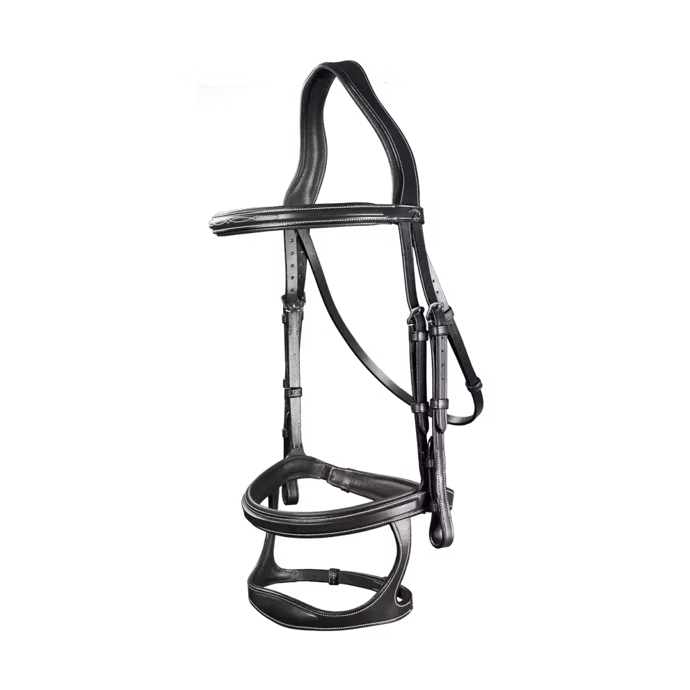 Något fyrkantigt upphöjt pannband med dekorativa sömmar 2-i-1 snaffle och nedfällt nosgrimma. Beroende på önskad effekt kan snaffle eller tappad version användas (effekten av den tappade nosgrimman utan dess begränsningar för att inte trycka på mungiporna). Spänne på näsgrimman monterad på en vadderad skyddande läderbaksida. Den främre delen av den tappade näsgrimman är gjord av extra smidigt läder