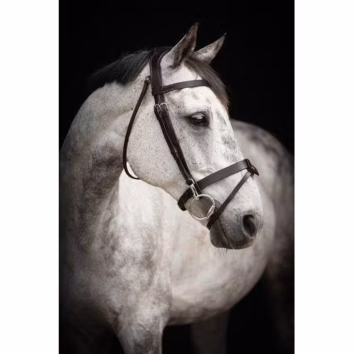 Aachenträns i mjukt oljat läder. Platt ofodrat pannband och nosgrimma med avtagbart aachenfäste. Ställbar käkrem och sidostycken med hakar. Nackstycket är brett, fodrat och svängt för att motverka tryck vid det känsliga området bakom öronen. Silverfärgade spännen.