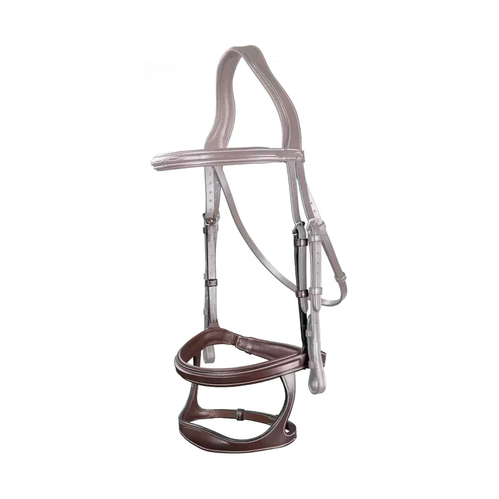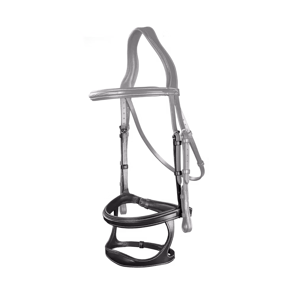 2-i-1-snaffle och nedfälld nosgrimma. Beroende på den önskade effekten kan snaffle eller tappad version användas (effekten av den tappade nosgrimman utan dess begränsningar för att inte trycka på mungipan). Spänne på näsgrimman monterad på en vadderad skyddande läderbaksida. Den främre delen av den tappade nosgrimman är gjord av extra smidigt läder. Kompatibel med huvudstycken från US jumping Collection