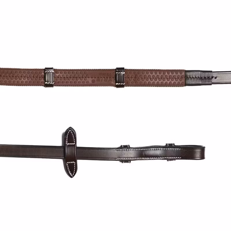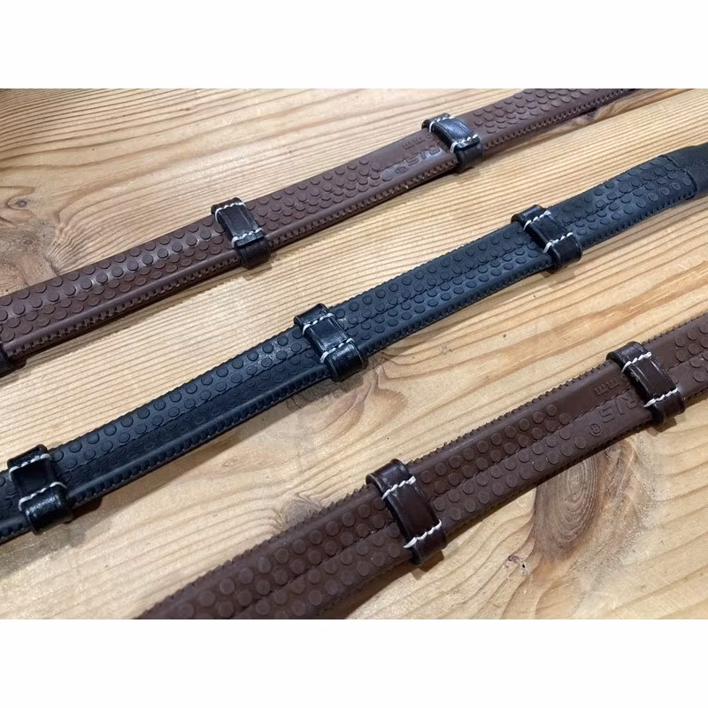 High-quality leather and rubber reins matching all the Week Collection bridles. There are two stops to block the martingale if there is one and numerous leather stops on the rubber part to prevent the rider to loose their reins. They are attached to the bit with leather straps that close towards the inside so the buckles stay discreet and are linked to one another with a classic buckle.