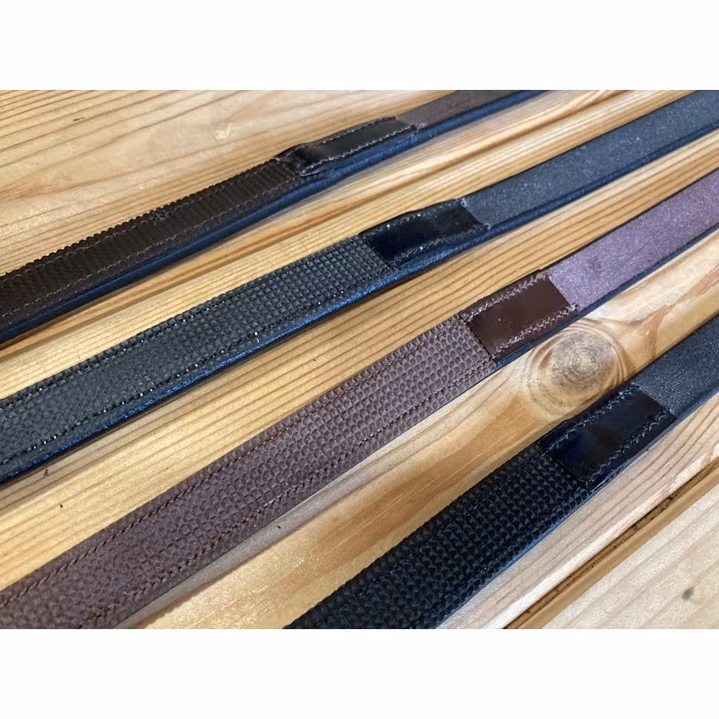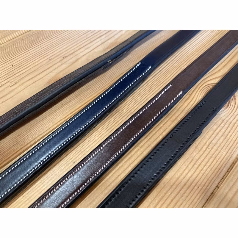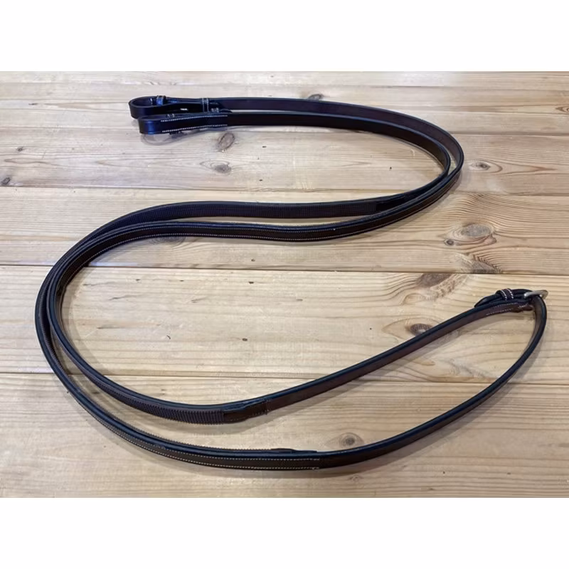 High-quality Jump'In flat leather reins. They are thinner than the traditional flat leather reins with one plain leather side while the other is lined with a rubber grip. They can be one of the two required pairs forming a double bridle but can also be used with a simple bridle.