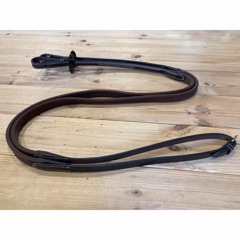 High-quality leather and rubber reins matching the Jump'In Wednesday Bridle (available HERE). The ends are slightly rounded and enhanced by the main feature of this model: a thin fancy. They are attached to the bit with leather straps that close towards the inside so the buckles stay discreet.
