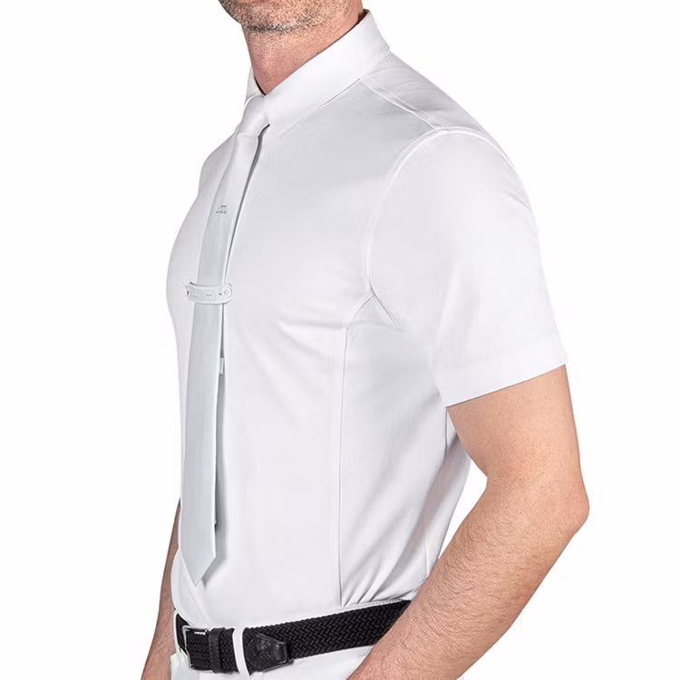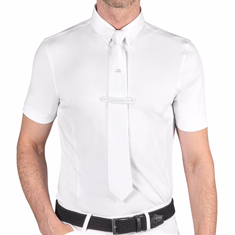 Victork kortärmad herrskjorta från EquilineStilren tävlingsskjorta med broderad logga på kragen.Stretchig och andas mycket bra, bekväm att ha på sig hela dagen