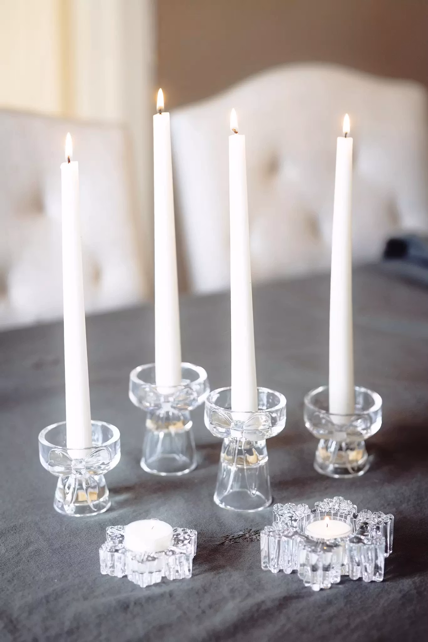 Lys upp rummet med levande ljus med denna ljusstake med rosett. Passar både kronljus och värmeljus. Tillverkad i glas. Finns i flera storlekar.