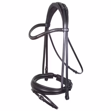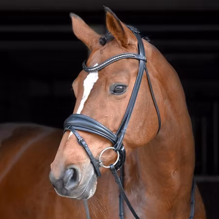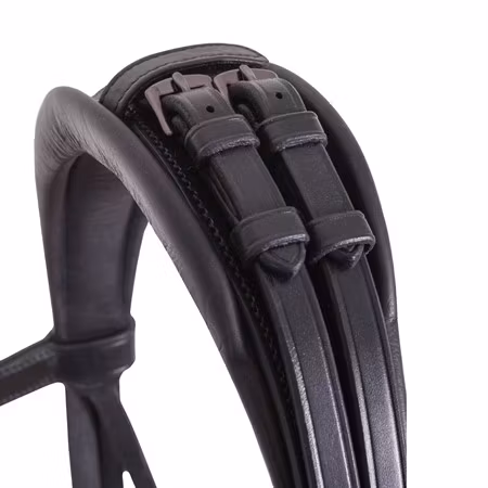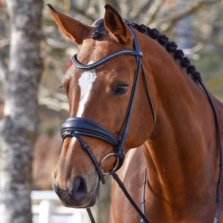 Elegant dressyrträns i exklusivt italienskt läder där sidostyckena har spännen i nacken för diskret look. Nosgrimma med pullback-funktion. Mjuk padding i nackstycke och nosgrimma.
