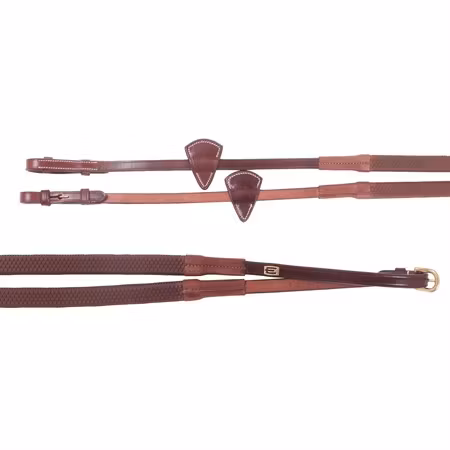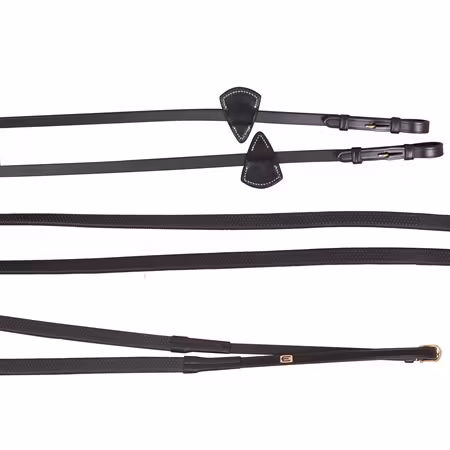 Gummityglar med exklusivt italienskt läder och vita sömmar. Martingalstoppar med vit söm och spännen i mässing. Lyxig E-logga som pricken över i:et.
