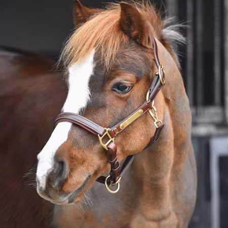 Elegant grimma i exklusivt italienskt läder med vita sömmar och spännen och hakar i mässing. Paddad i nackstycket och över nosen för skön passform. Lyxig E-logga i mässing på vänster sida som pricken över i:et. Tom mässingsskylt på vänster sida för namngravyr, fäst med skruvnitar för att vara enkel att ta av och på vid gravyr.