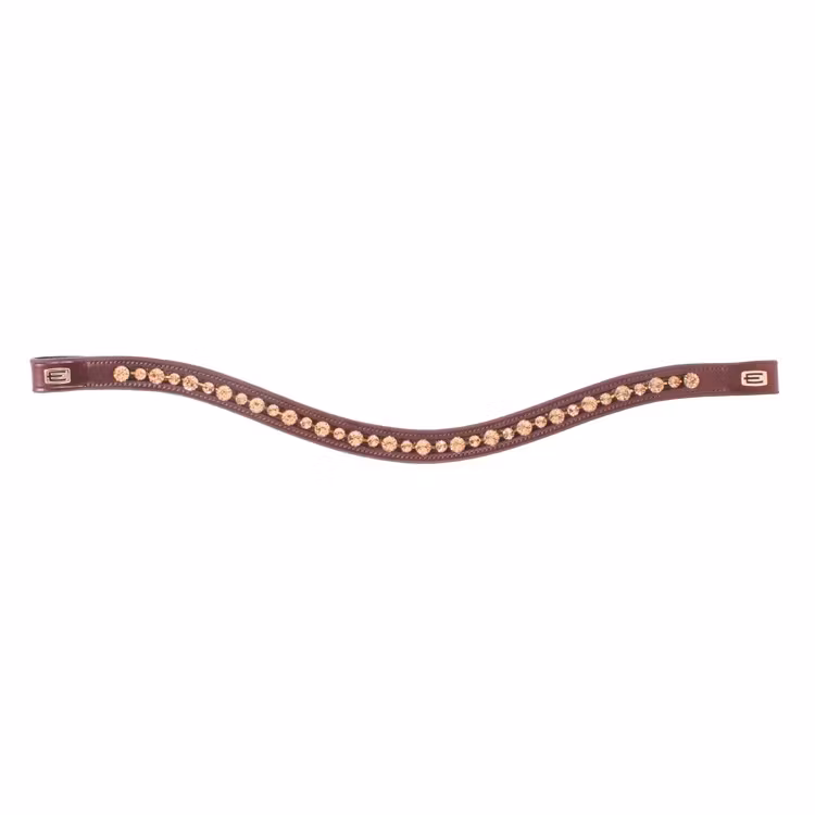 Elegant svängt pannband i exklusivt italienskt läder. Pannbandet har lyxig E-logga i mässing på båda sidor.Längd Ponny: 38 cm. Längd Full: 43,5 cm.