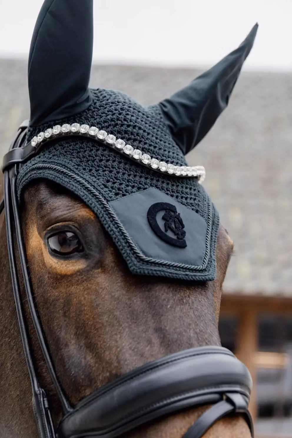 Denna Kentucky Horsewear huva skyddar hästens öron mot flugor under ridning.