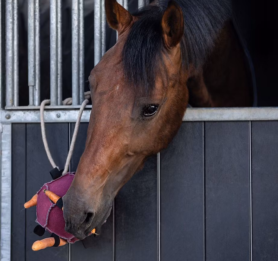 Fin hästleksak att hänga i stallet eller hage. Du kan enkelt fästa morötter med hjälp av de elastiska öglorna. Detta säkerställer ännu roligare för din häst och förhindrar stress och tristess.