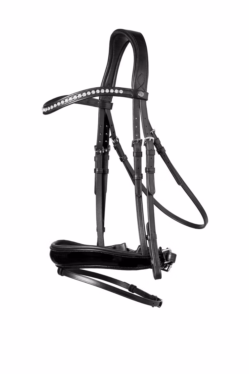 TRUST Rotterdam dressyrträns är ett vackert träns med en bred patenterad nosgrimma. Den breda anatomiska nosgrimman har supermjuk stoppning för extra komfort. Nosgrimsremmen är fodrad med nylon, vilket förhindrar att nosgrimman sträcker sig och säkerställer en perfekt passform. Nosgrimman smalnar av mot ändarna och ger mer frihet vid bettet. Nosgrimman pekar också upp mot mitten av hästens nos vilket gör den ännu mer anatomiskt utformad. Blixtremmen har ett spänneskydd vilket innebär att spännet aldrig vidrör hästens nos. Pannbandet har Stellux™-stenar av finaste kvalitet som ger ett elegant utseende. Stenarna är djupt liggande så att de inte faller ut. Pannbandet är något böjt. Huvudstycket är anatomiskt format och avskuret för att ge mer frihet vid öronen. Vadderingen är mjuk men inte för tjock så att direktkontakt med hästen bibehålls.